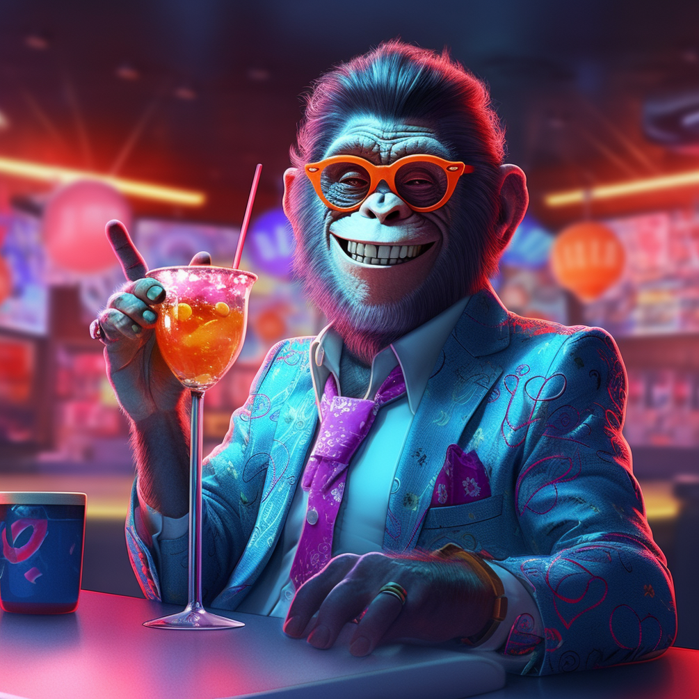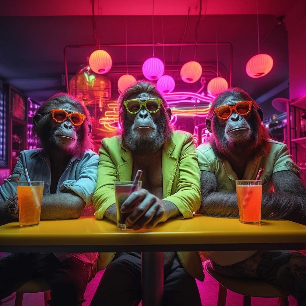 5 images of happy chimps drinking in a wine bar, alone or together. For your marketing, ADS, flyier or web site
